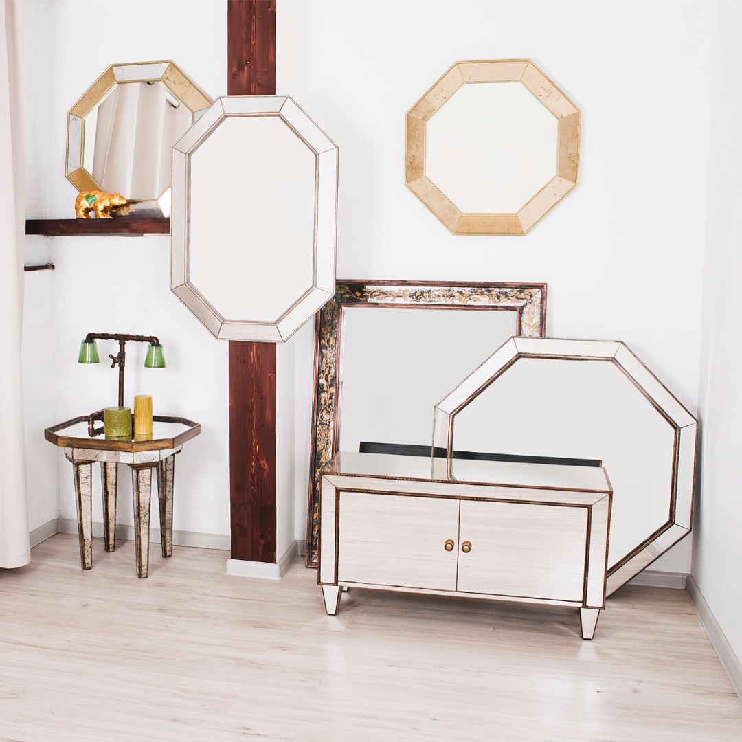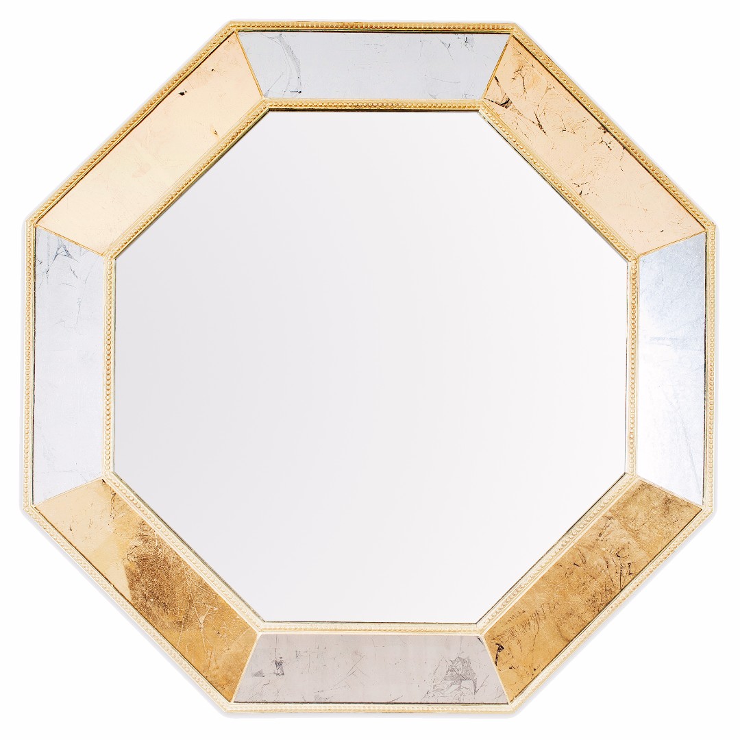 Эксклюзивное зеркало ручной работы выполнено в форме роскошного золотого бриллианта с золотой состаренной каймой. Над его созданием кропотливо трудились руки самых искусных мастеров. Благодаря гармоничному сочетанию классического, золотого поталевого и серебряного поталевого зеркал обыкновенный предмет интерьера превратился в настоящее произведение искусства. Зеркало идеально дополнит пространство прихожей, а также станет центральным элементом в оформлении гостиной или спальни хозяев дома. По контуру рамы идет золотая состаренная окантовка.